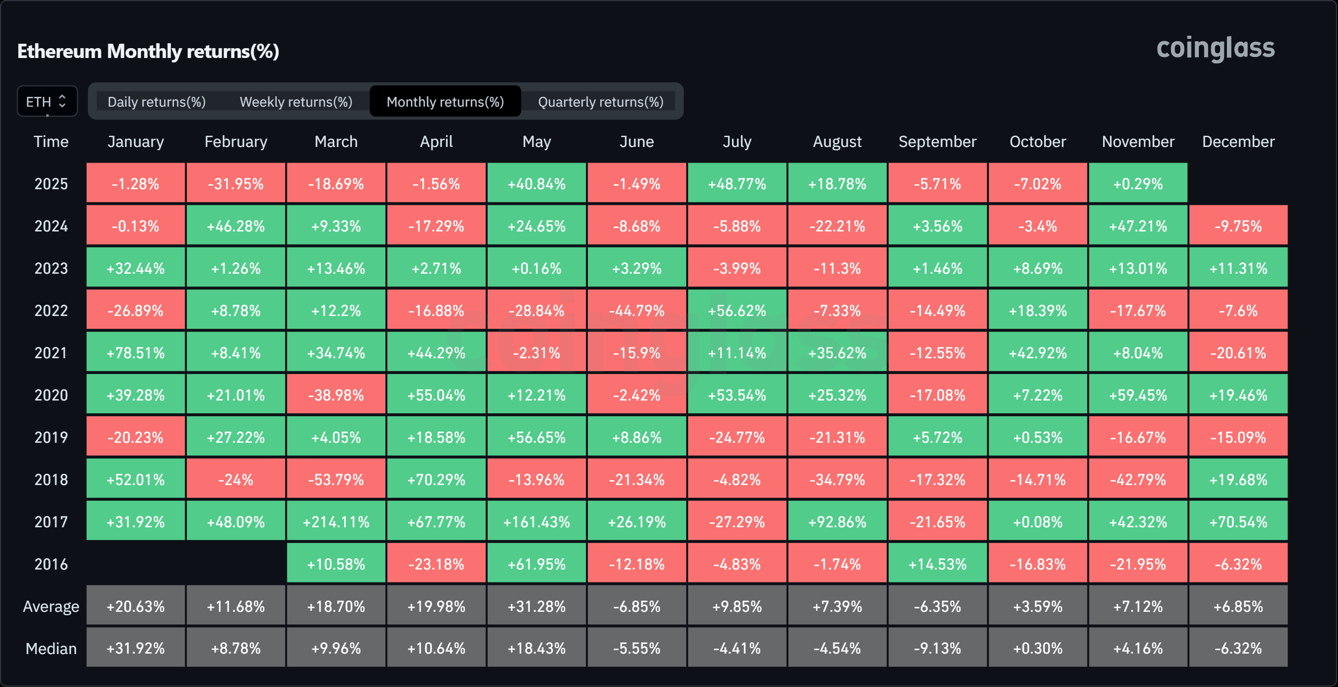 The examination of the long-term averages shows that January (+20.63%), May (+31.28%), and November (+7.12%) are the months when Ethereum performs best, indicating a pattern of consistent early-year rallies but weaker finishes throughout the year. The quarterly data from Coinglass supports this cycle: in Q1, Ethereum lost 45.41%; in Q2, it bounced back by 36.48%; in Q3, it rocketed up by 66.55%; and in Q4, it fell by 6.75%.