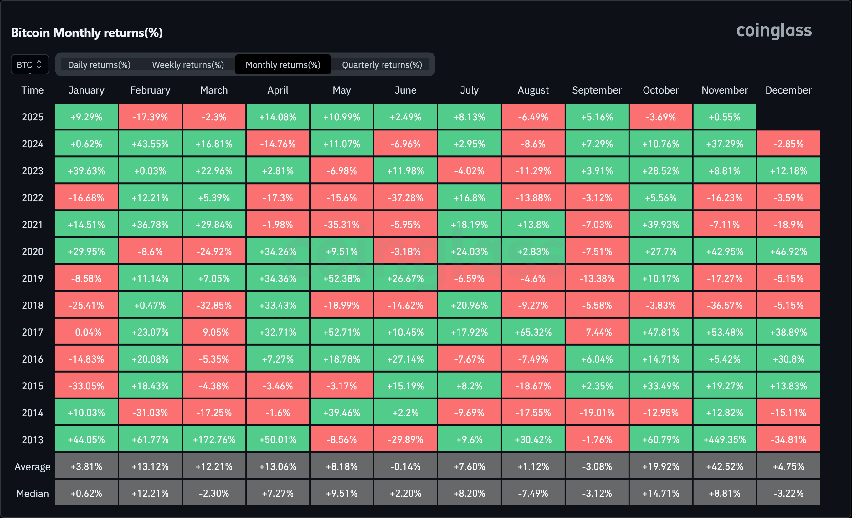 Historically, the monthly return of Bitcoin, on average, was +3.81%, while the median return was +0.62%, indicating a moderate but stable power of compounding. October is typically the month that yields the best result, with an average of +19.92%, leading to the conclusion that the dip in 2025 is quite an anomaly compared to the past. Furthermore, the statistics indicate that after the drop in November and December, the price would have been steadier at the end of the year if trends were to repeat.