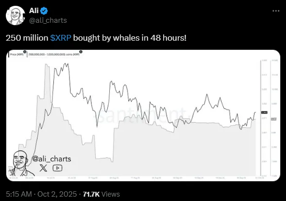 Martinez also said that within 48 hours, whales bought 250 million $XRP. Historically, such concentrated activity shows confidence in the token’s performance and provides a degree of asset stability. Through such large-scale acquisition, the risk to the sell side diminishes, thereby facilitating the establishment of stronger price support levels. If that stays ongoing, the month ahead could see positive momentum for the XRP, insofar as the market boosts its confidence.