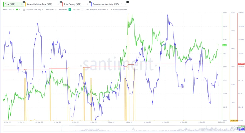 On-chain metrics as provided by Santiment offer an additional perspective. The six-month chart tracked price, annual inflation rate, total supply, and development activity. Current price data records XRP at $2.962, consistent with earlier market observations. The total supply remains fixed at 100.09 billion XRP, aligning with the red line, while circulation hovers close to that figure, preventing inflationary pressure.