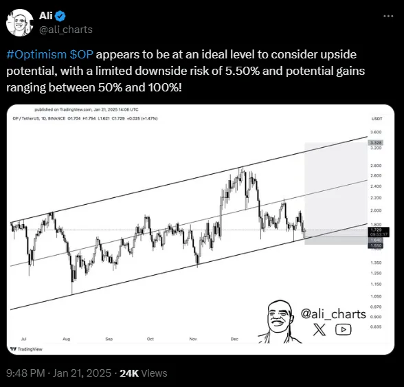 According to technical analyst Ali, OP is positioned at an attractive level for investors seeking upside potential. The analysis highlights a limited downside risk of approximately 5.50%, offering a favorable risk-to-reward ratio. Ali suggests that the token can deliver gains between 50% and 100%, making it a compelling opportunity for traders and long-term investors.